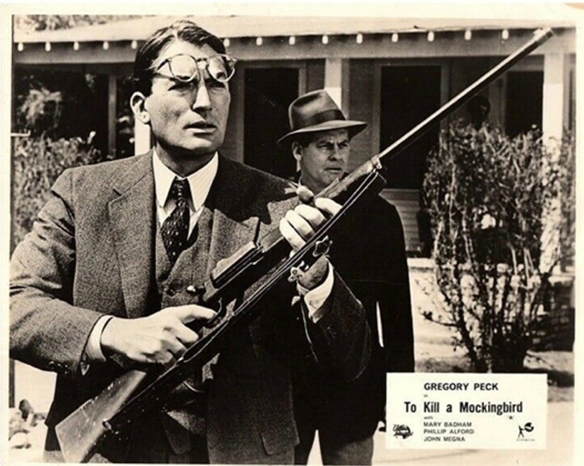 Gregory Peck’s Oscar-winning performance in the 1962 film adaptation is uniquely authentic. His politics and character aligned closely with Finch’s: he was an advocate for racial justice and, in later years, openly critical of the increasingly expansive interpretation of the Second Amendment. Across his career, Peck gravitated toward—and was sought out for—roles that placed conscience above command: lawyers, journalists, reluctant leaders who stood upright against institutional wrong. He described Mockingbird as his favorite film, noting that it offered him a role he recognized immediately as necessary. As Atticus, Peck embodies a moral authority established not by refusing all force, but by refusing its misuse. Near the end of his life, reflecting on gun violence in the wake of the Columbine school massacre, Peck framed the issue not as ideology but responsibility: